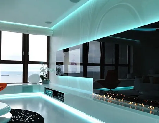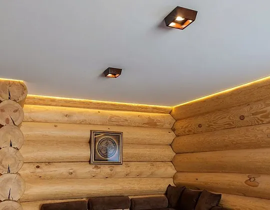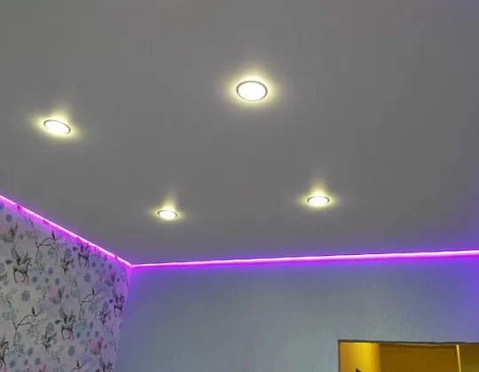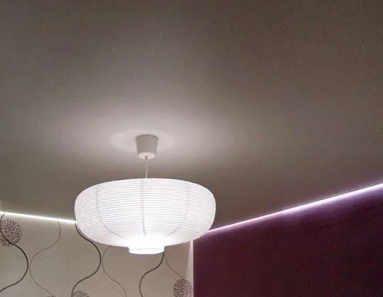 За матовым потолком проще ухаживать. Они отлично маскируют разводы и пыль не видна гораздо дольше. С точки зрения дизайна, матовый натяжной потолок является универсальным решением для различных интерьеров, о чем свидетельствуют многочисленные фото в сети. Используя цветную подсветку, можно мгновенно получить множество цветовых вариантов оформления, не прибегая к технологии окрашивания.