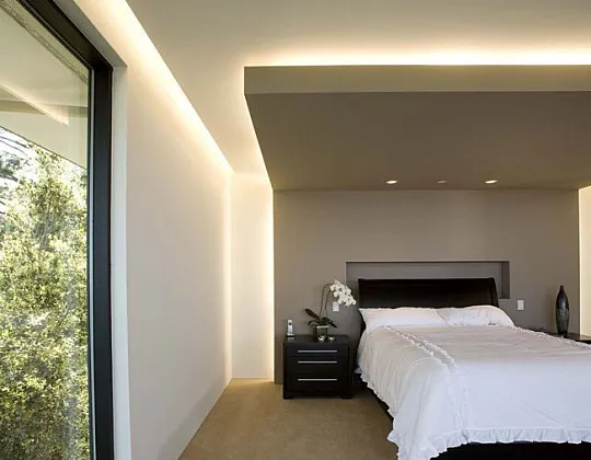 Парящий натяжной потолок с подсветкой в спальне, 12 м2