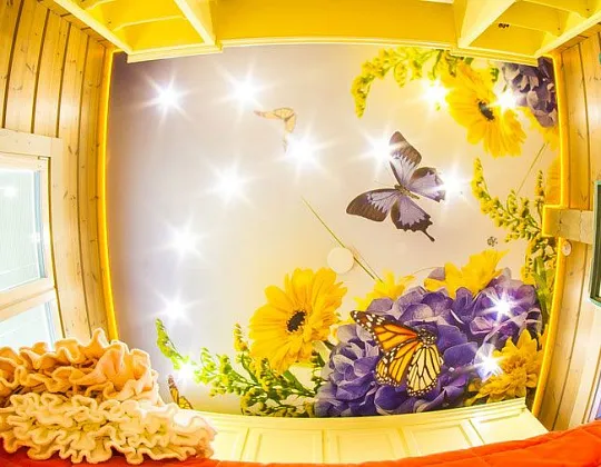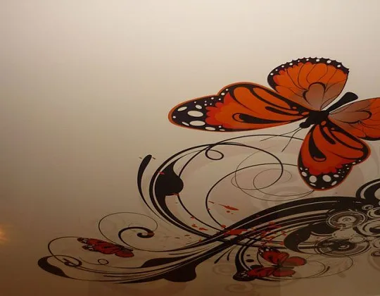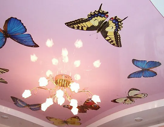 В каталог вошли 3Д изображения всех цветов и размеров. Здесь вы можете найти подходящий рисунок. Это могут быть бабочки, которые сидят на цветах, ветках, порхают в воздухе. Их можно расположить как по всему полотну, так и для декорирования угла и вокруг люстры.