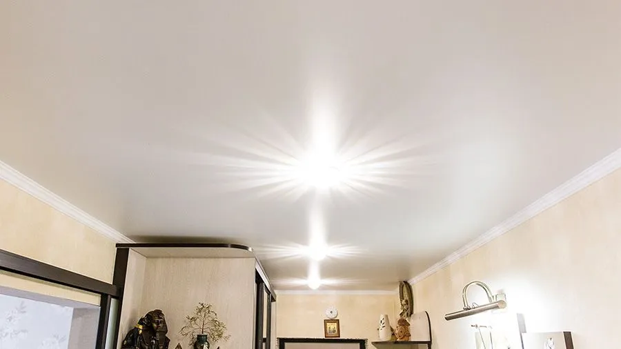 Сатиновые натяжные потолки имеют гладкую поверхность с легким жемчужным блеском.
